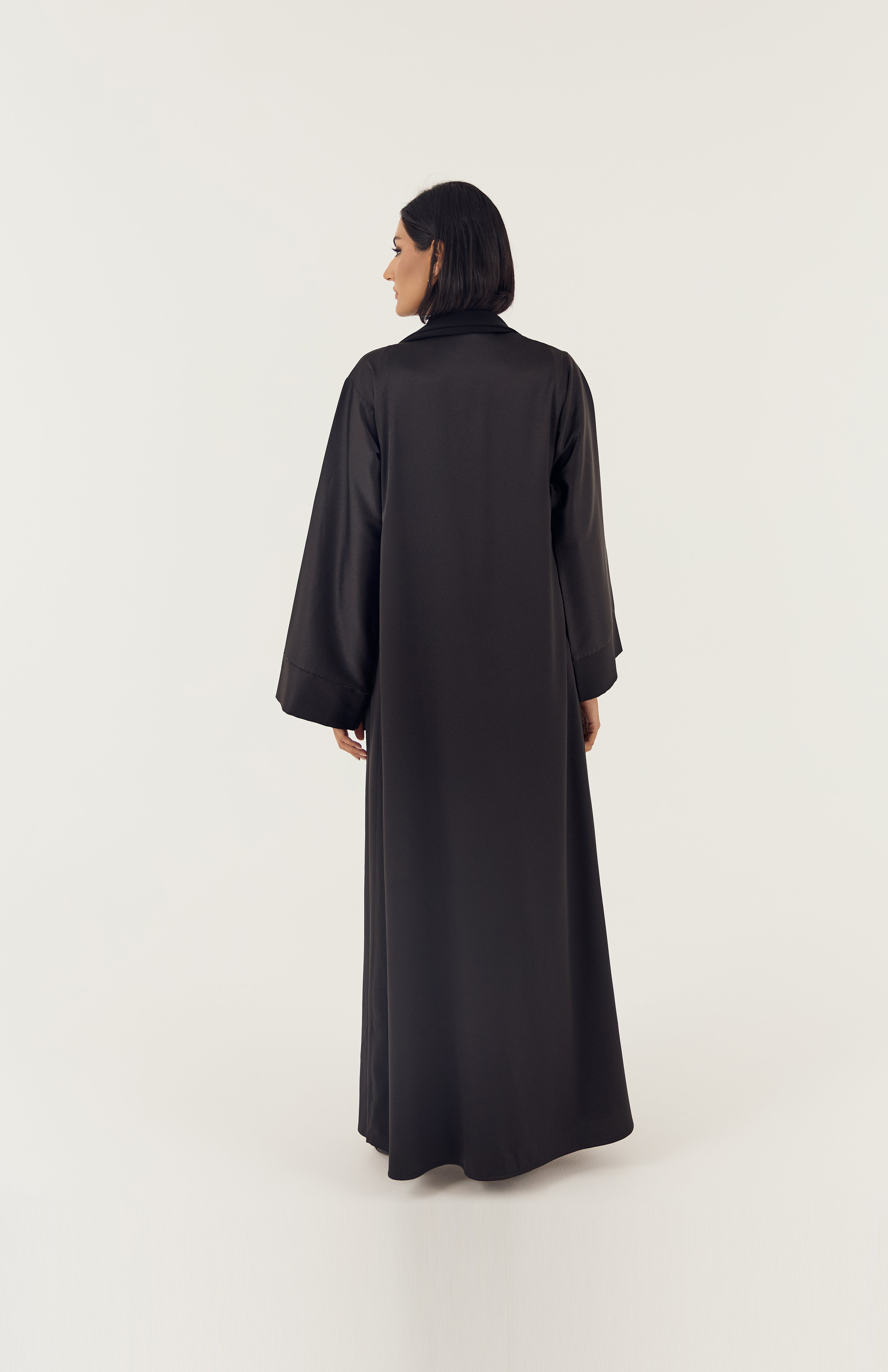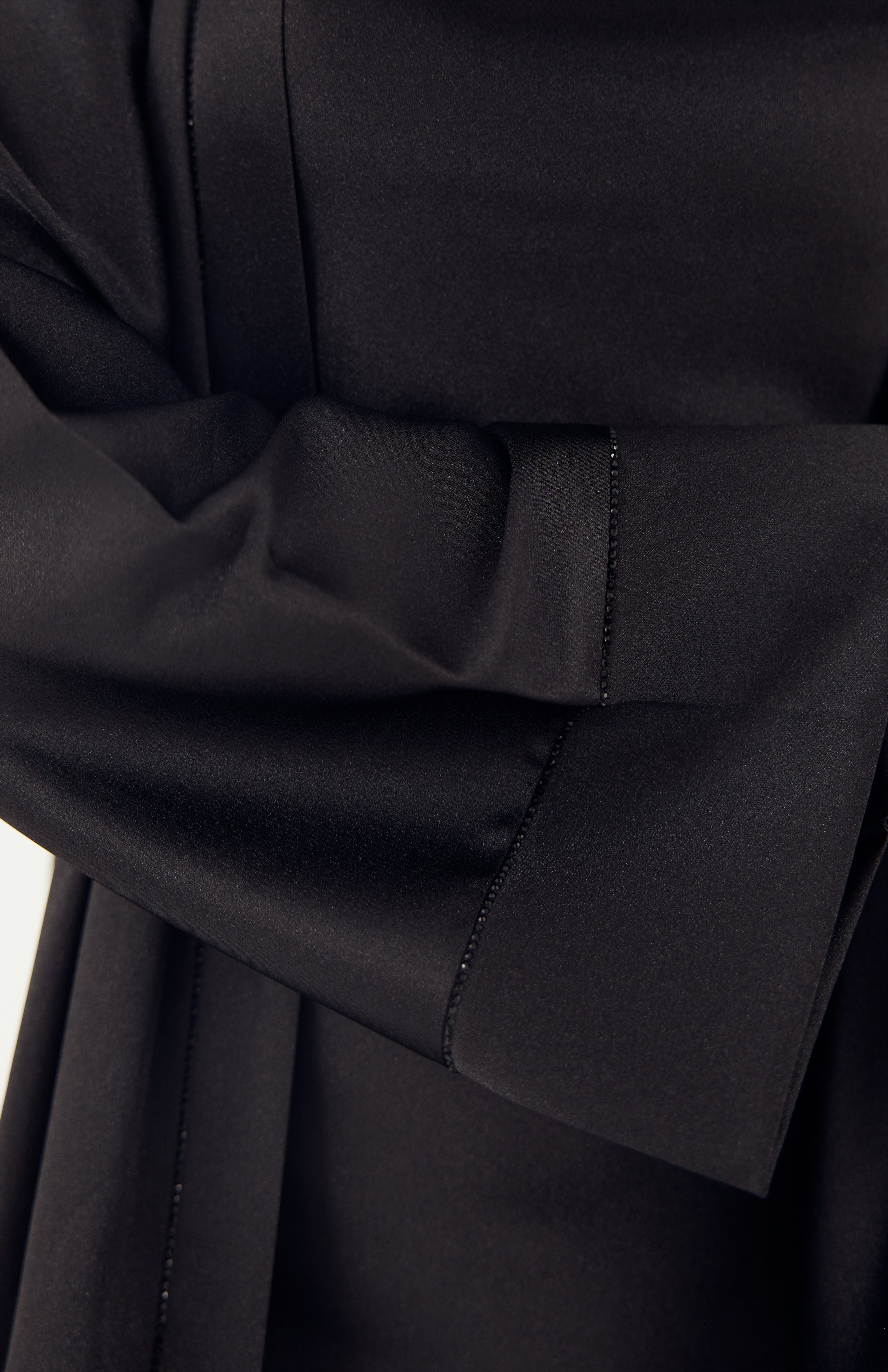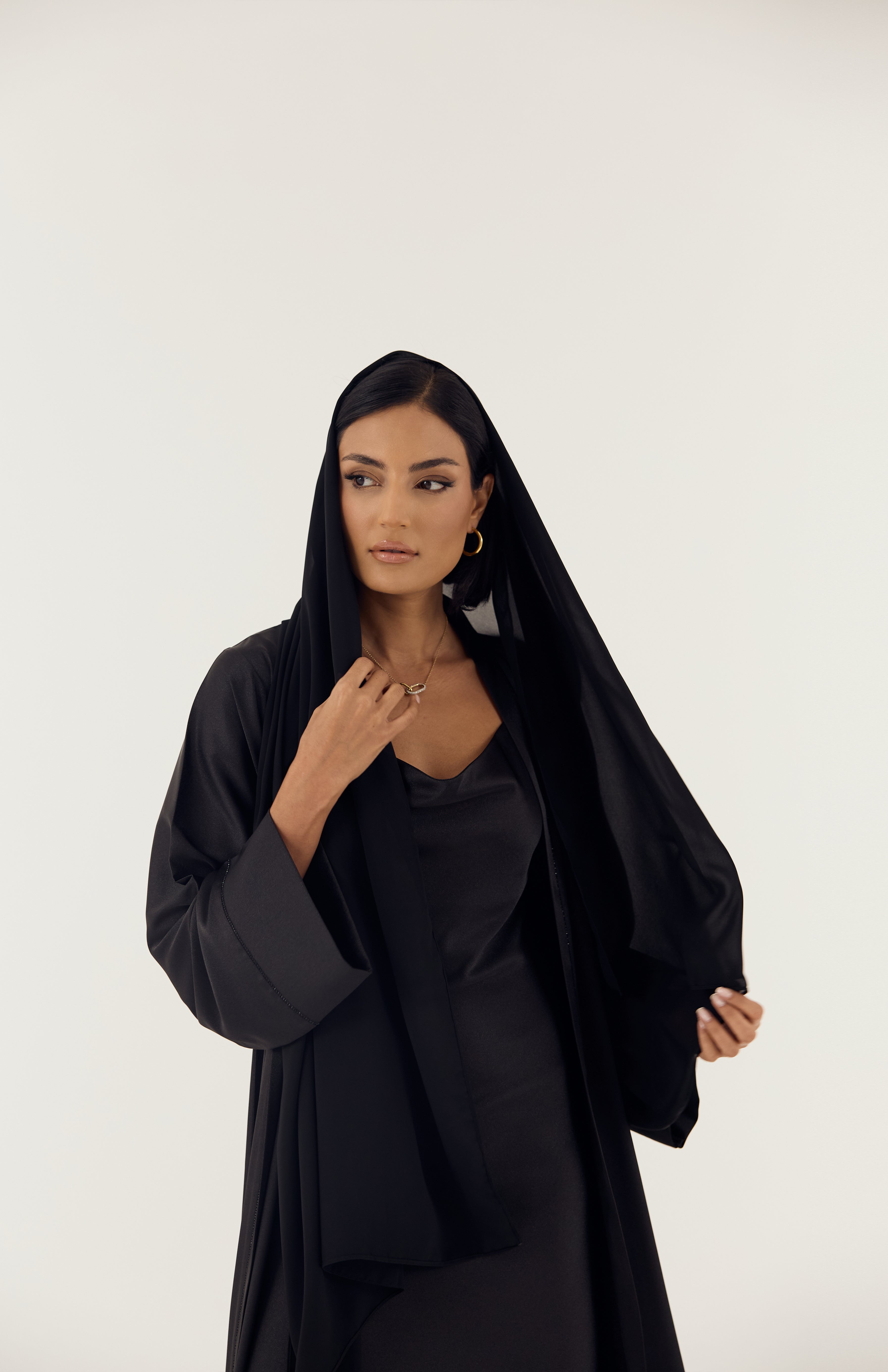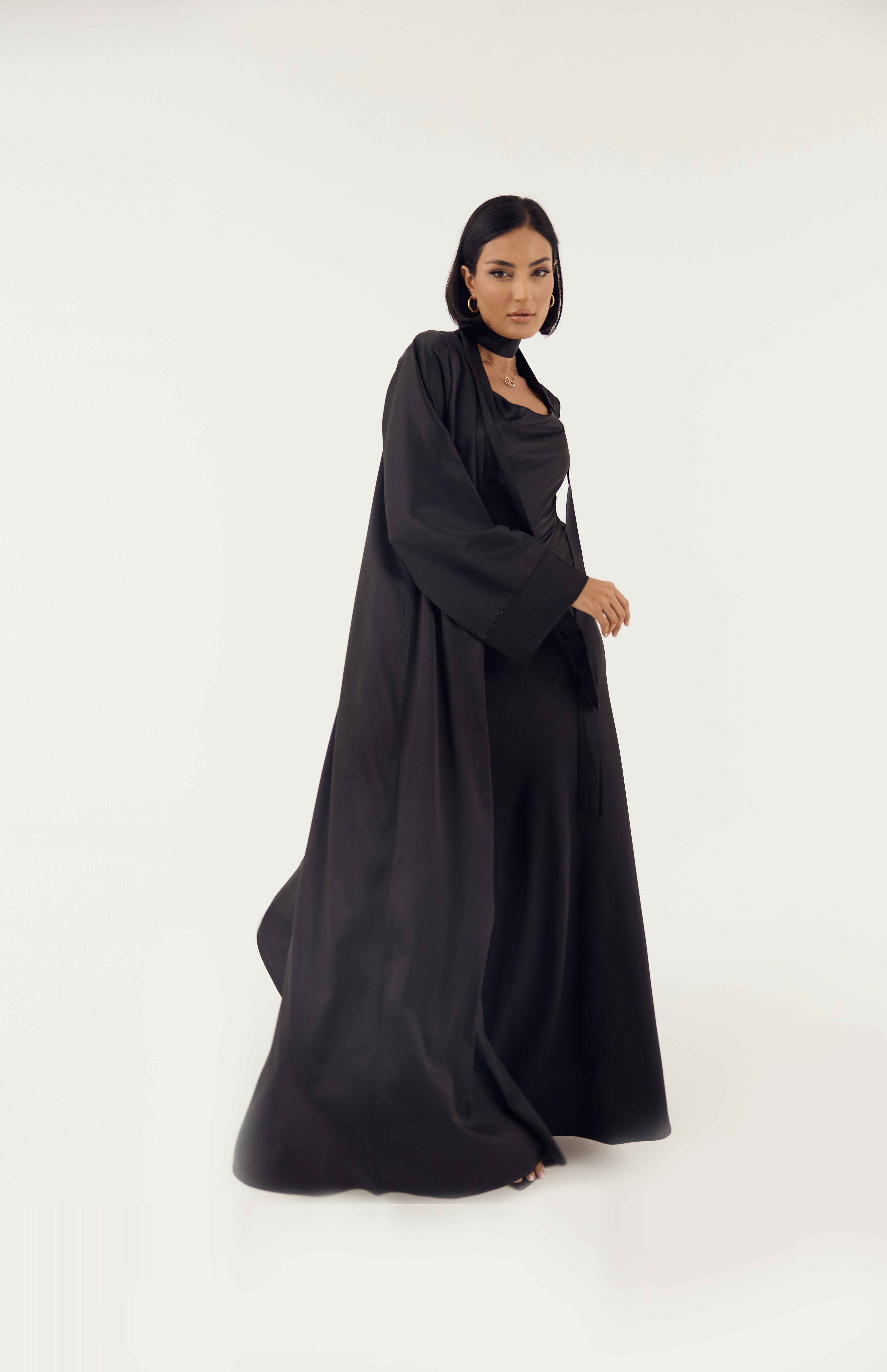 A full satin look, reimagined. This sophisticated four-piece ensemble includes a flowing maxi slip dress, a sleek bandeau top, an open abaya, and a coordinating belt — all crafted from lustrous Emirati satin. Lightweight, modest, and effortlessly chic, it’s designed to bring timeless refinement to your wardrobe. Perfect for evenings, special occasions, or elevated everyday wear.