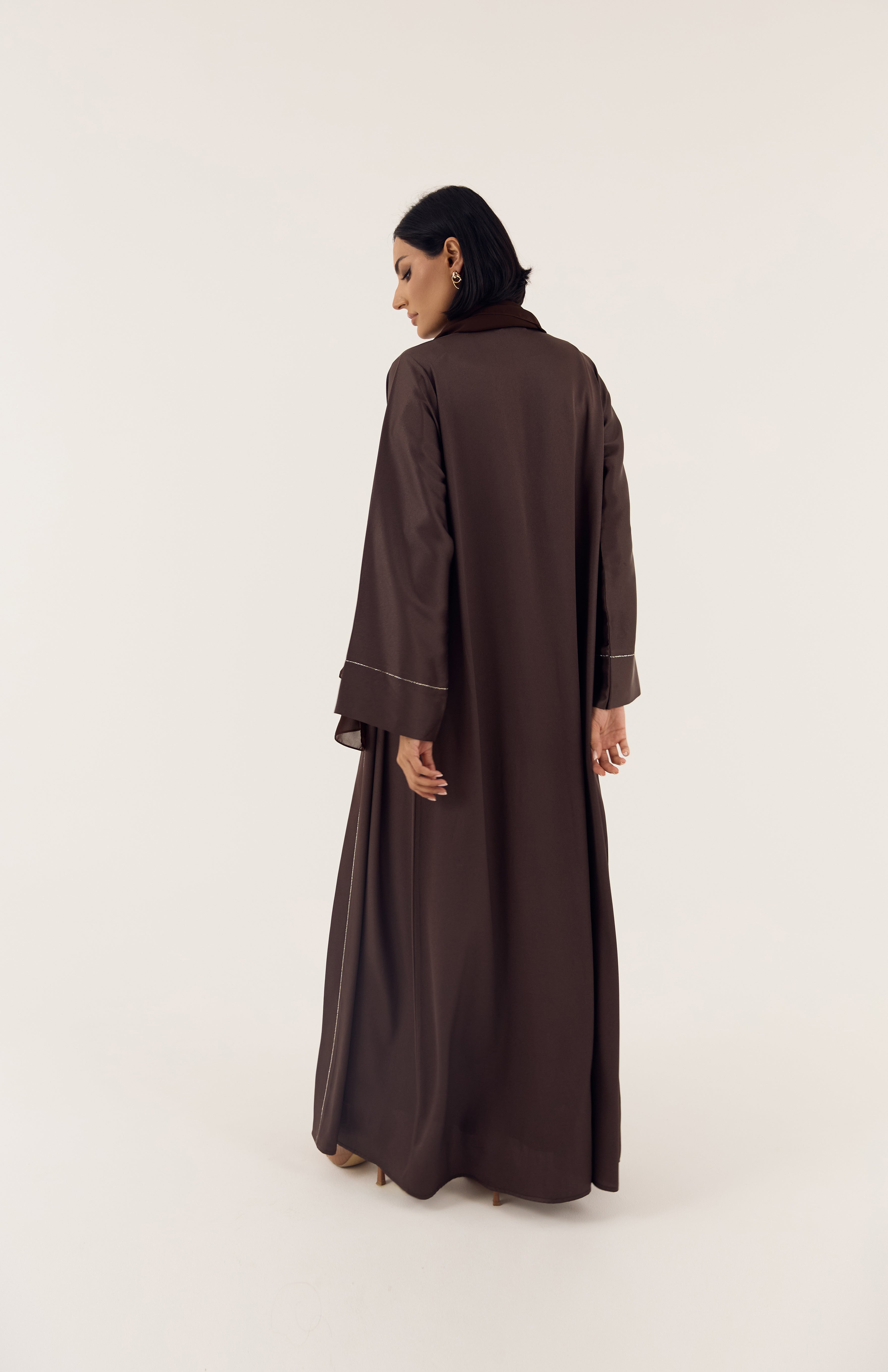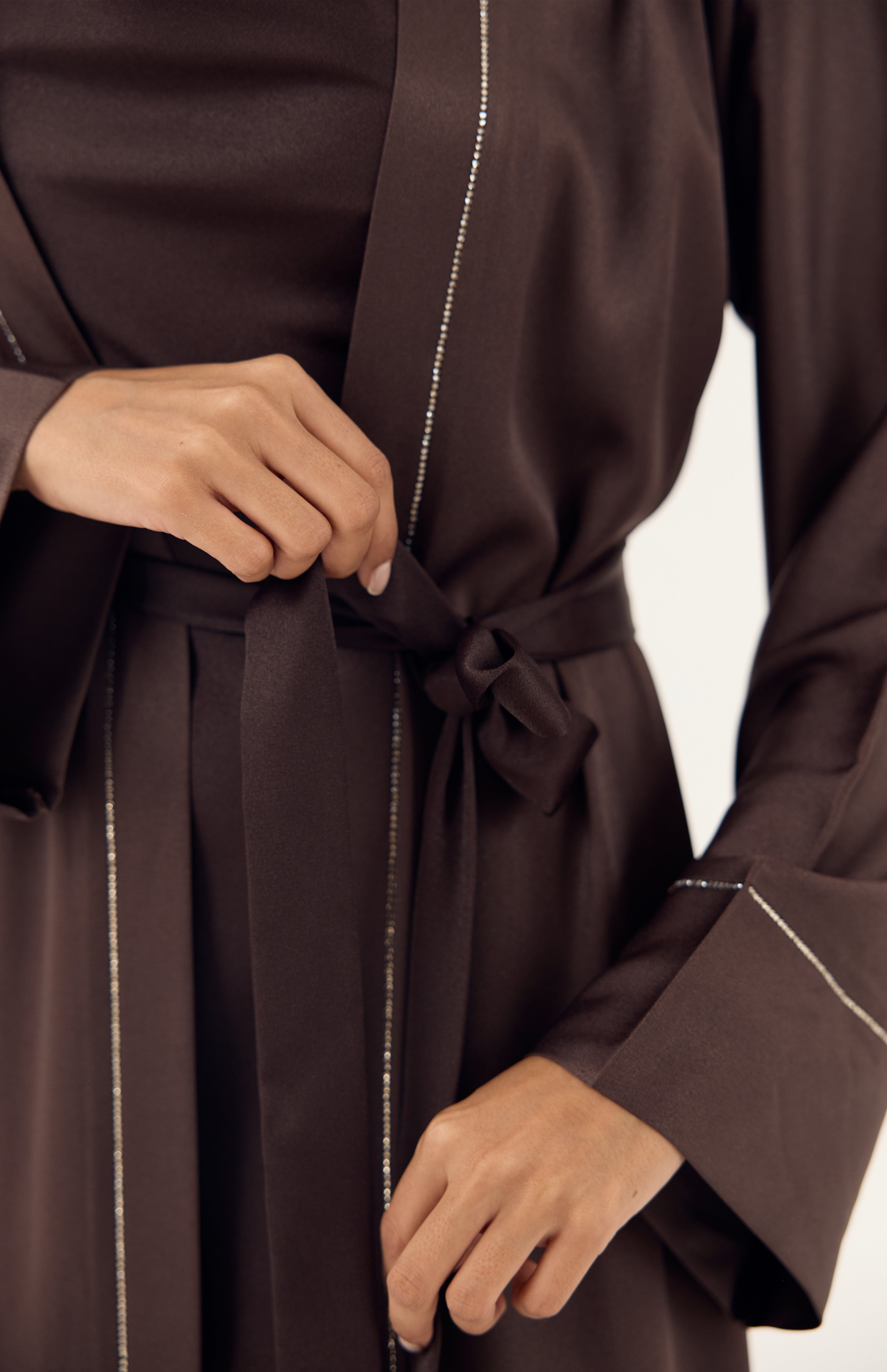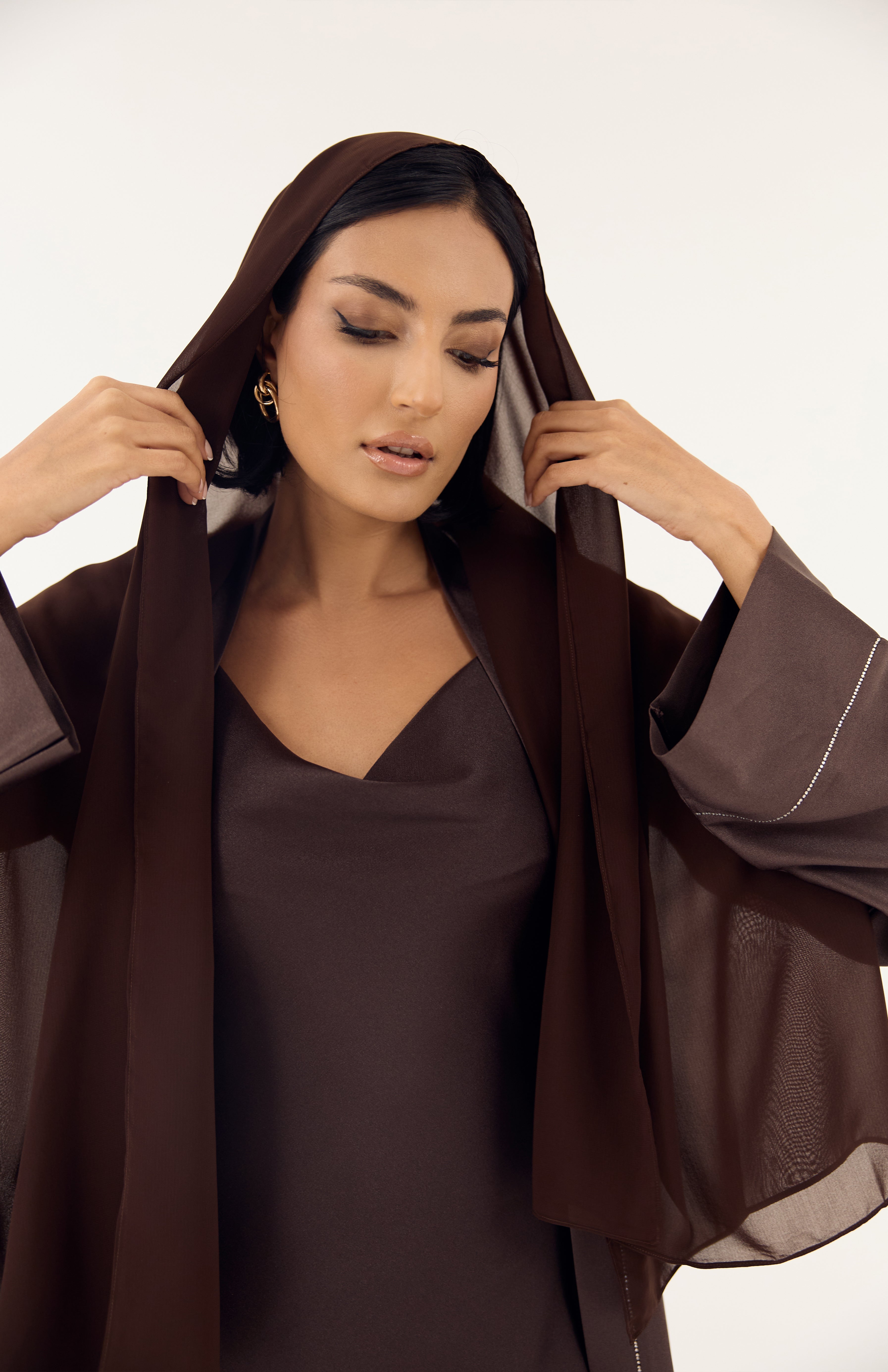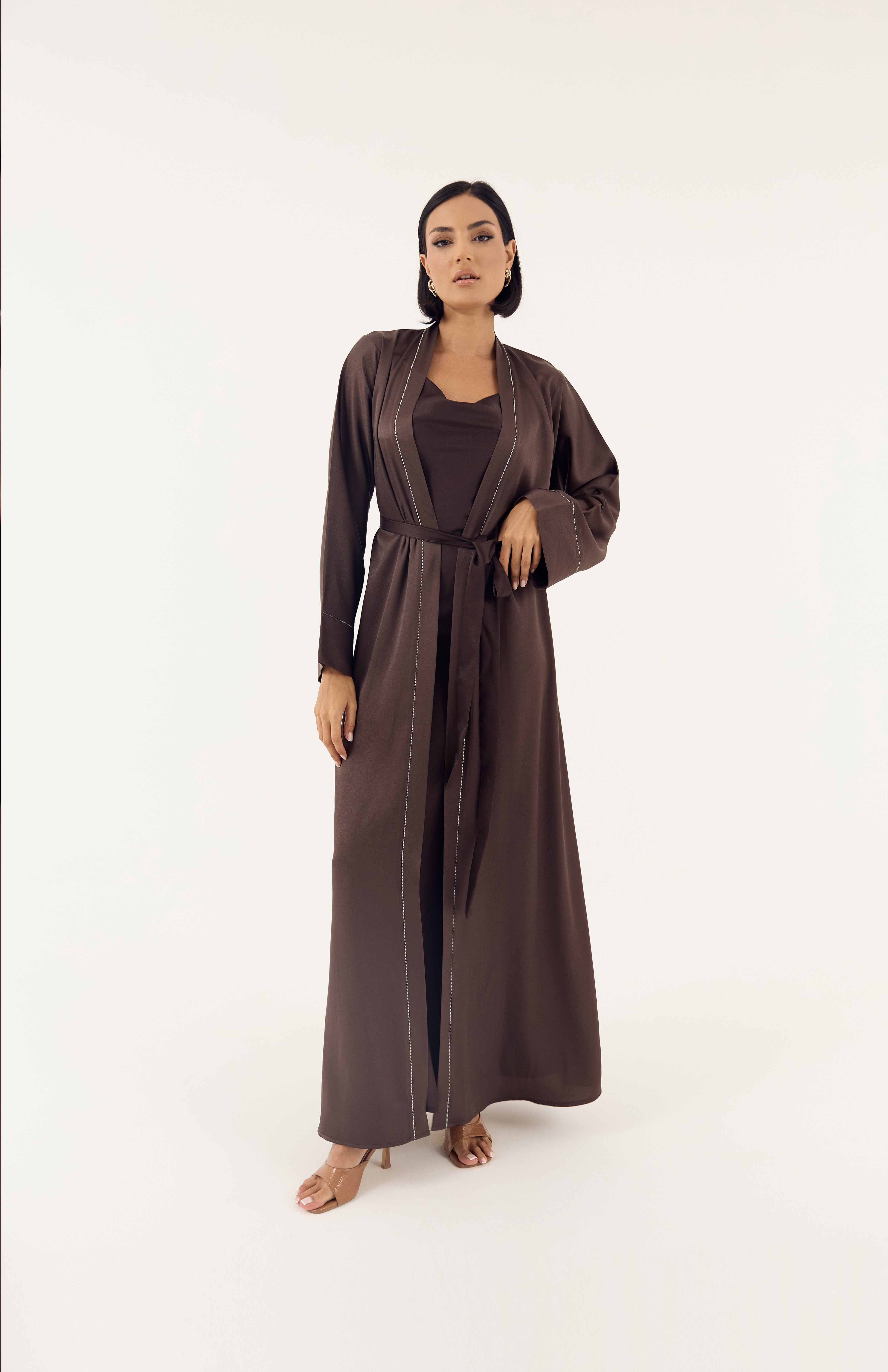 A full satin look, reimagined. This sophisticated four-piece ensemble includes a flowing maxi slip dress, a sleek bandeau top, an open abaya, and a coordinating belt — all crafted from lustrous Emirati satin. Lightweight, modest, and effortlessly chic, it’s designed to bring timeless refinement to your wardrobe. Perfect for evenings, special occasions, or elevated everyday wear.