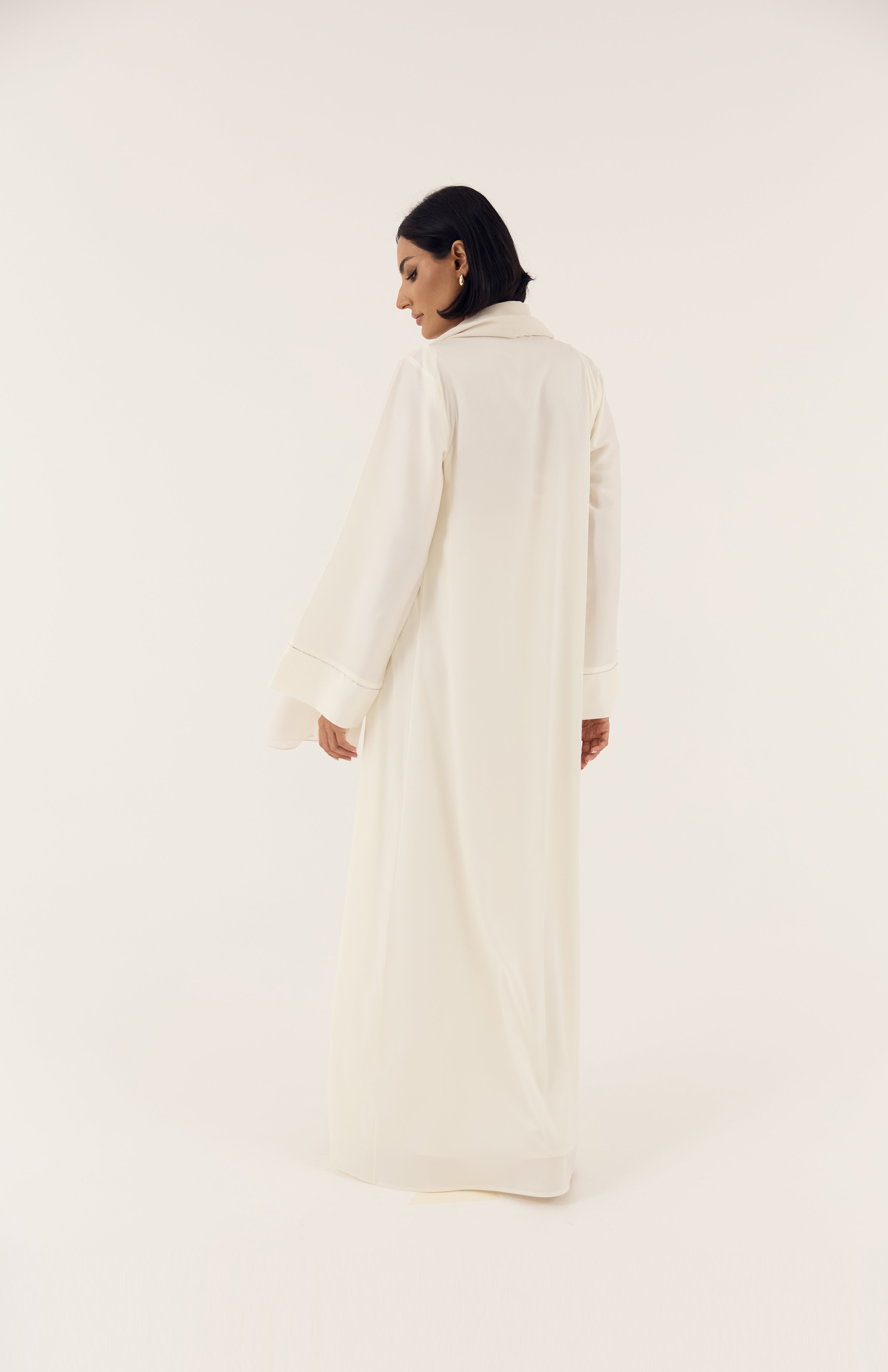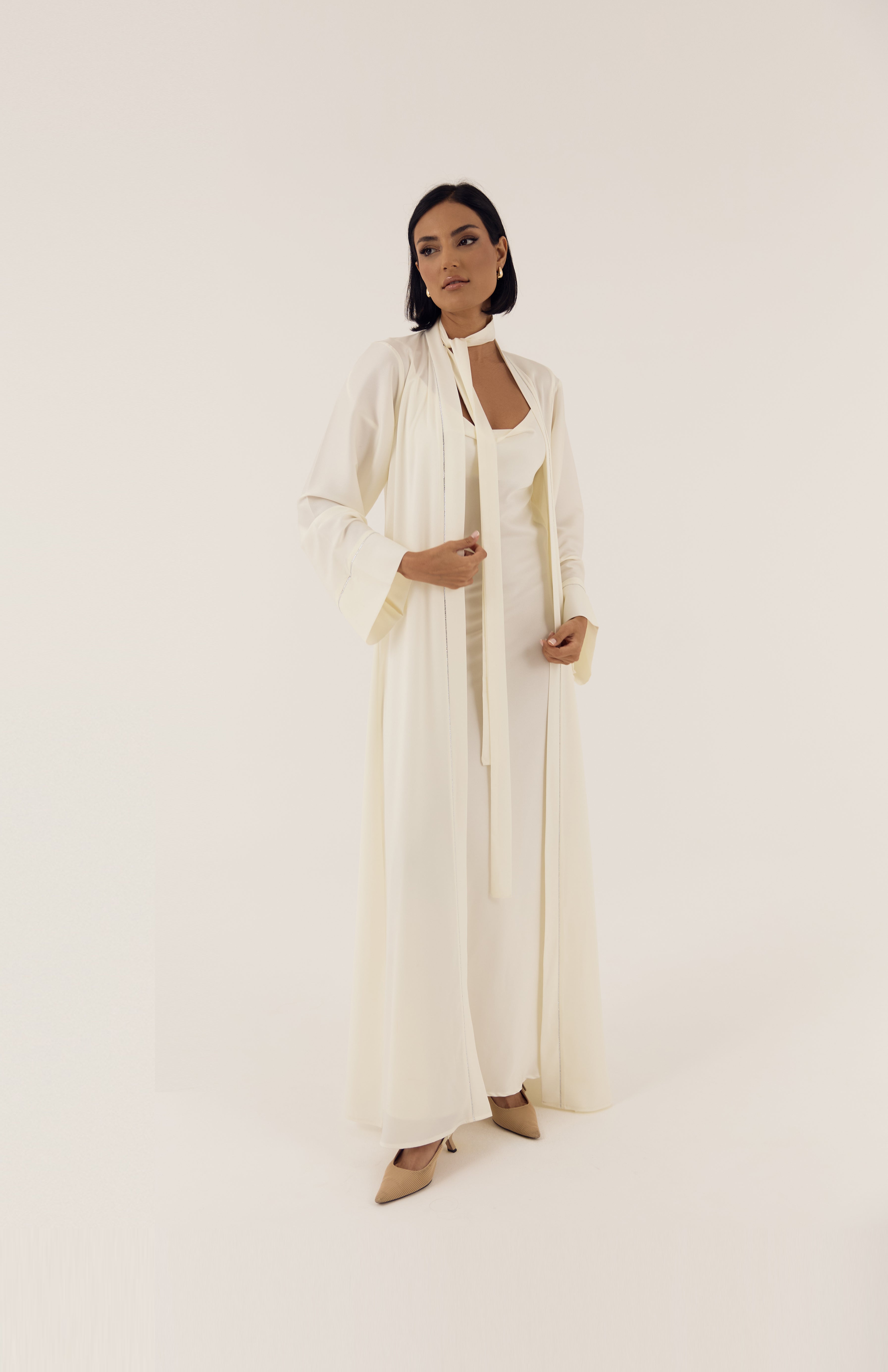 A full satin look, reimagined. This sophisticated four-piece ensemble includes a flowing maxi slip dress, a sleek bandeau top, an open abaya, and a coordinating belt — all crafted from lustrous Emirati satin. Lightweight, modest, and effortlessly chic, it’s designed to bring timeless refinement to your wardrobe. Perfect for evenings, special occasions, or elevated everyday wear.