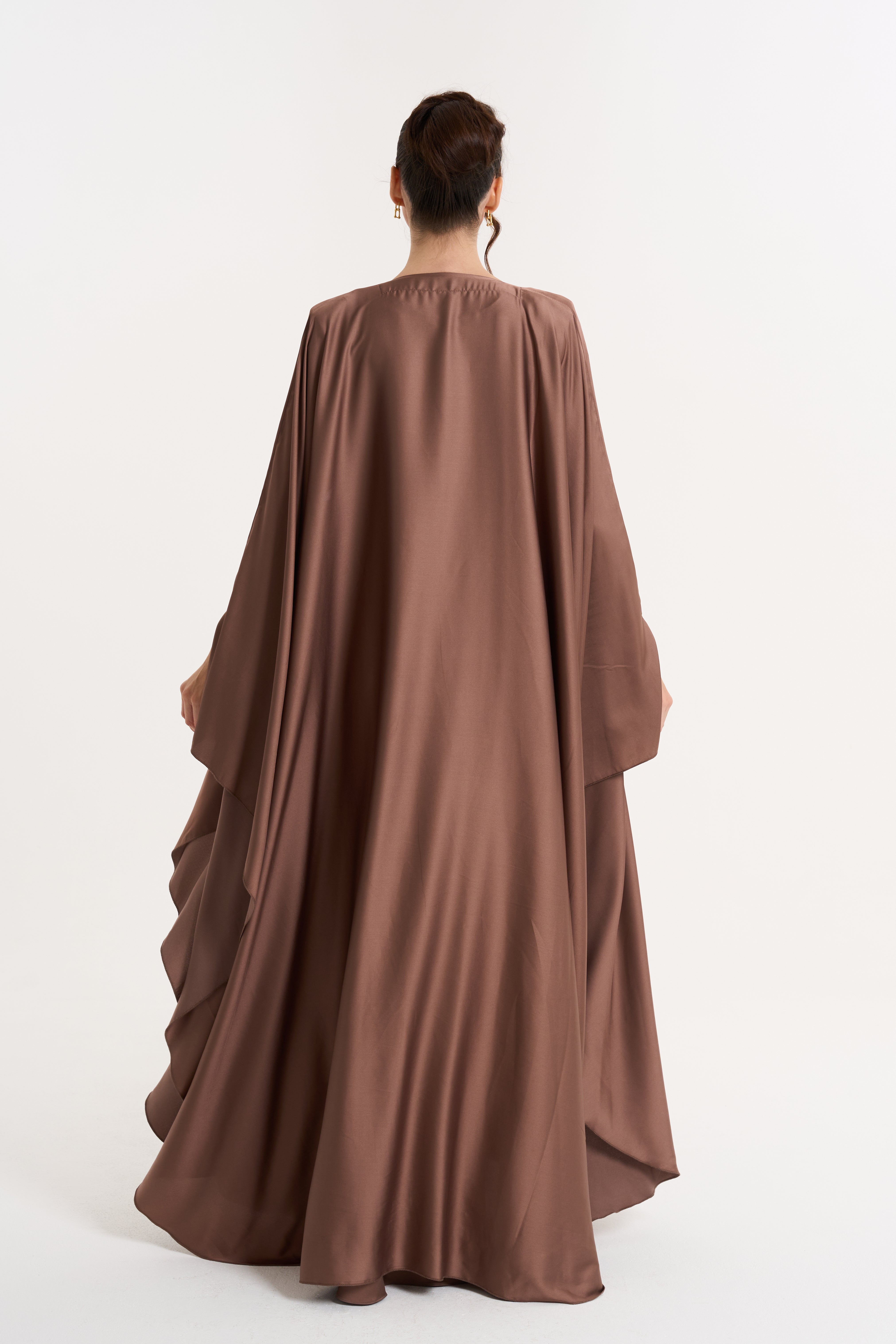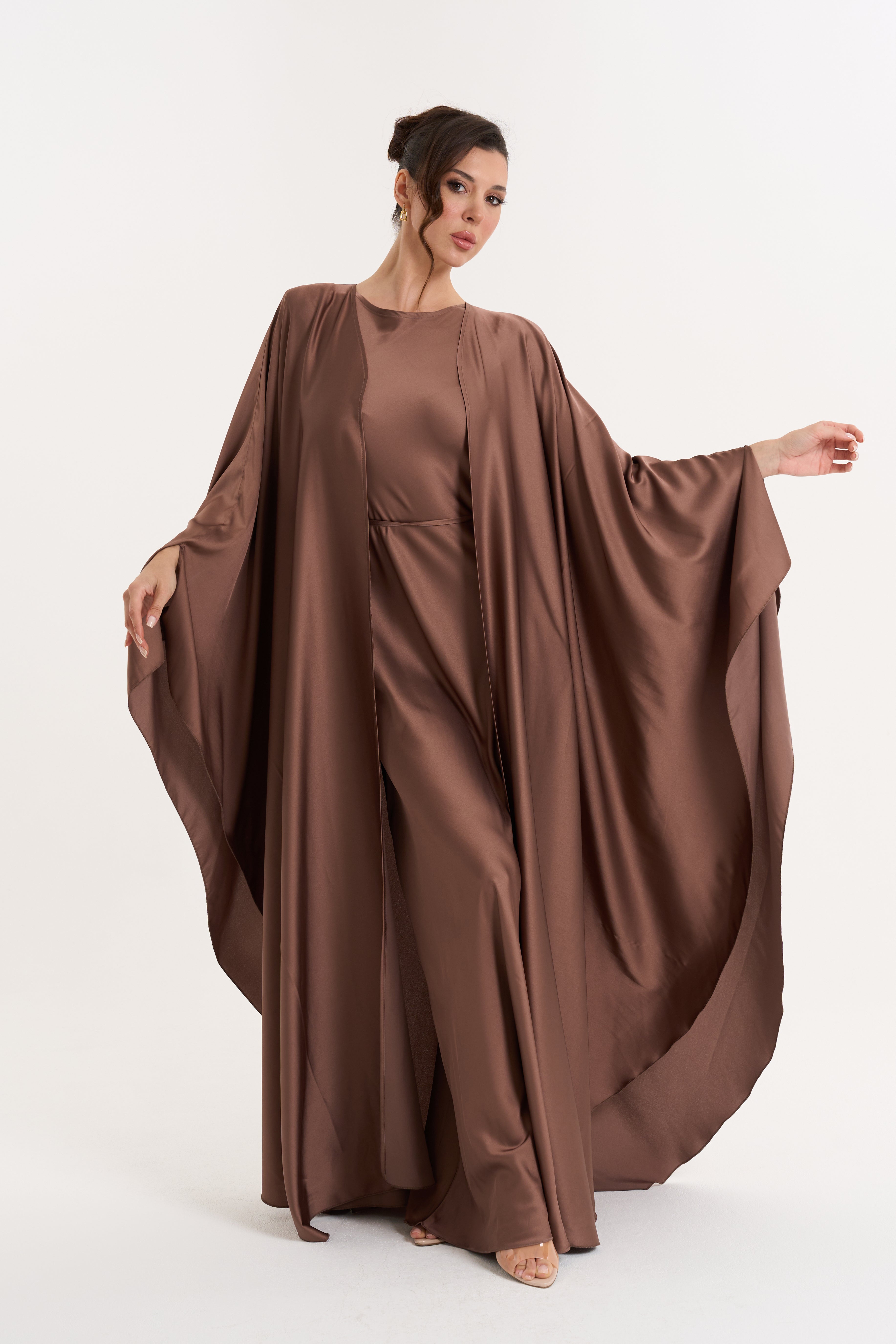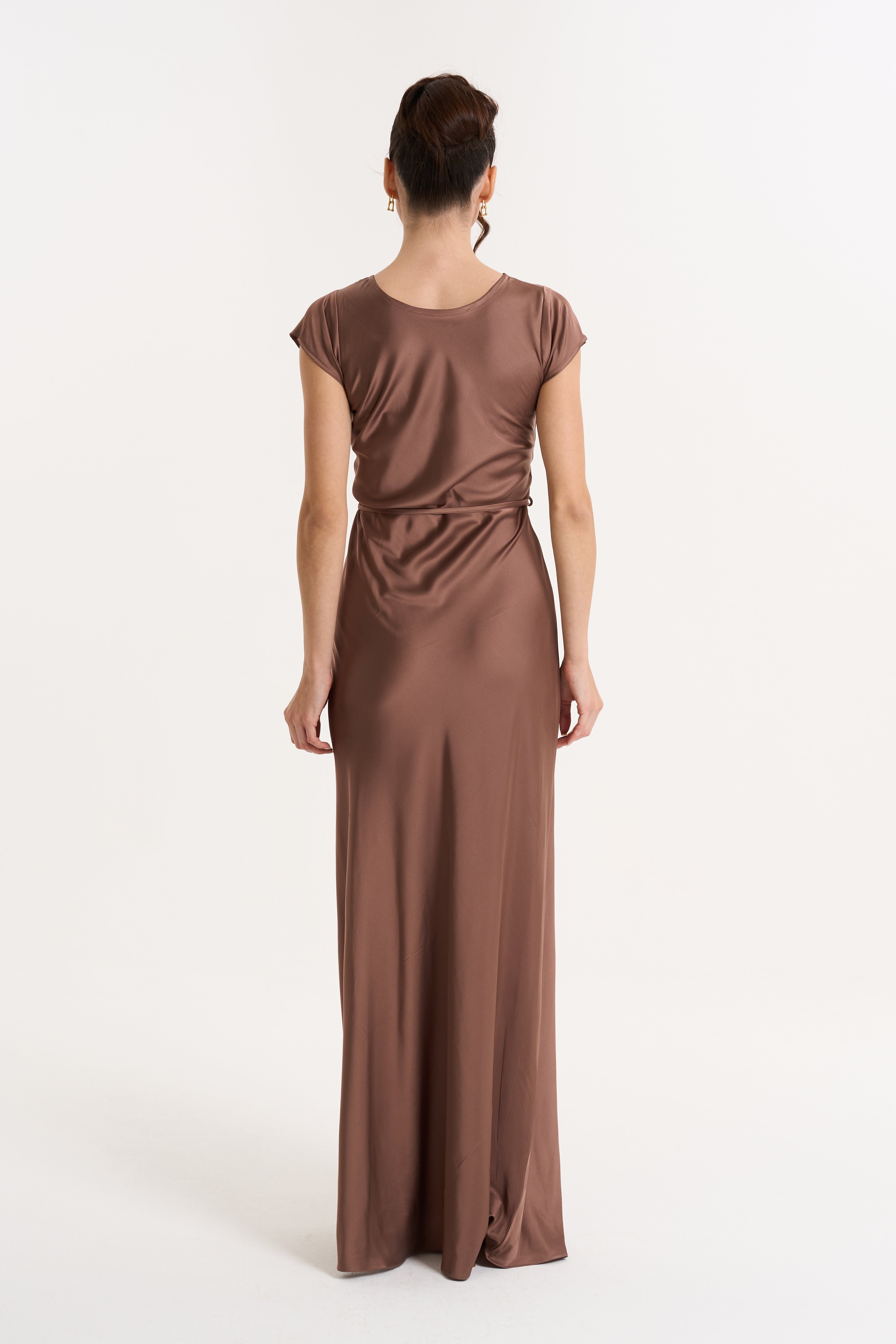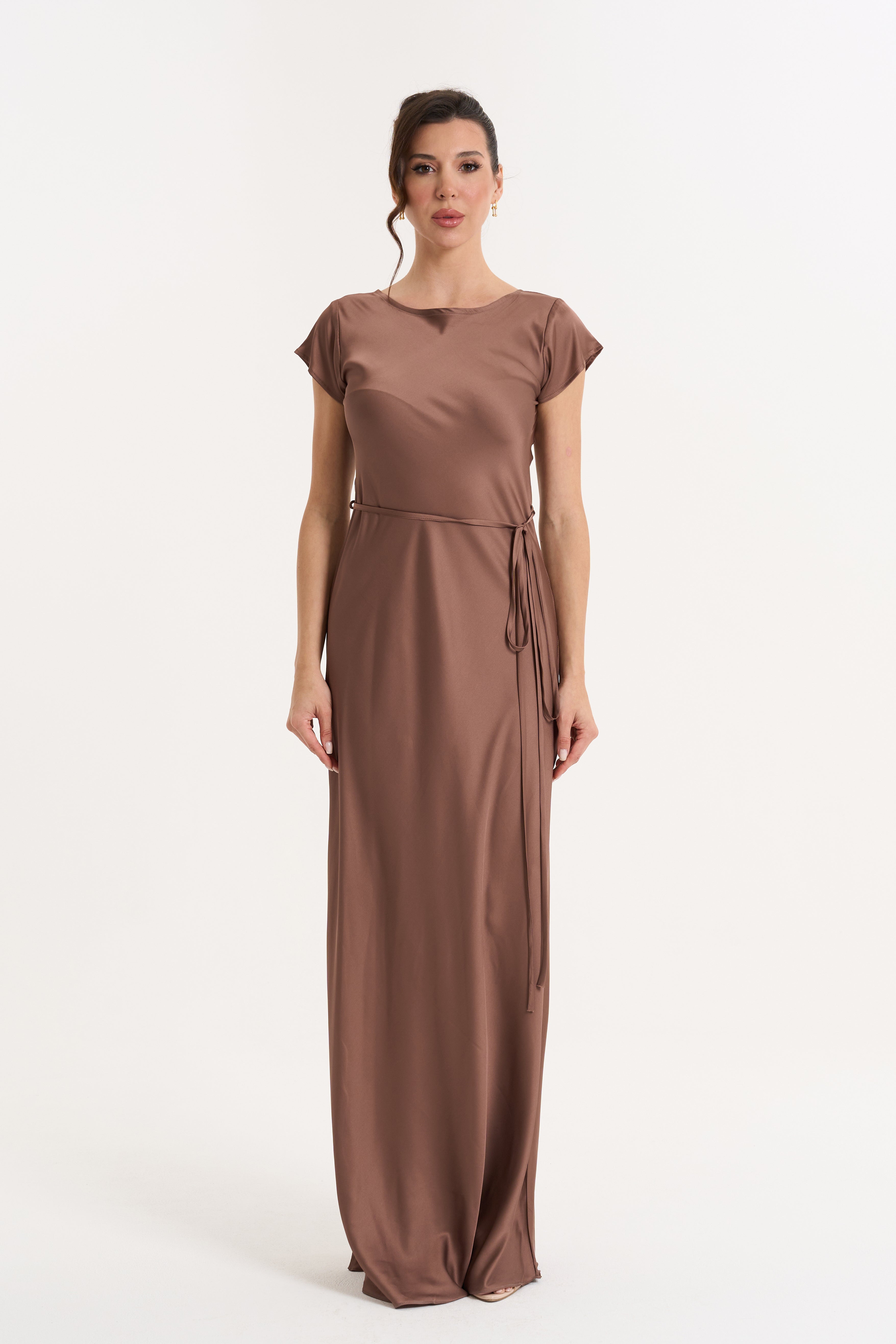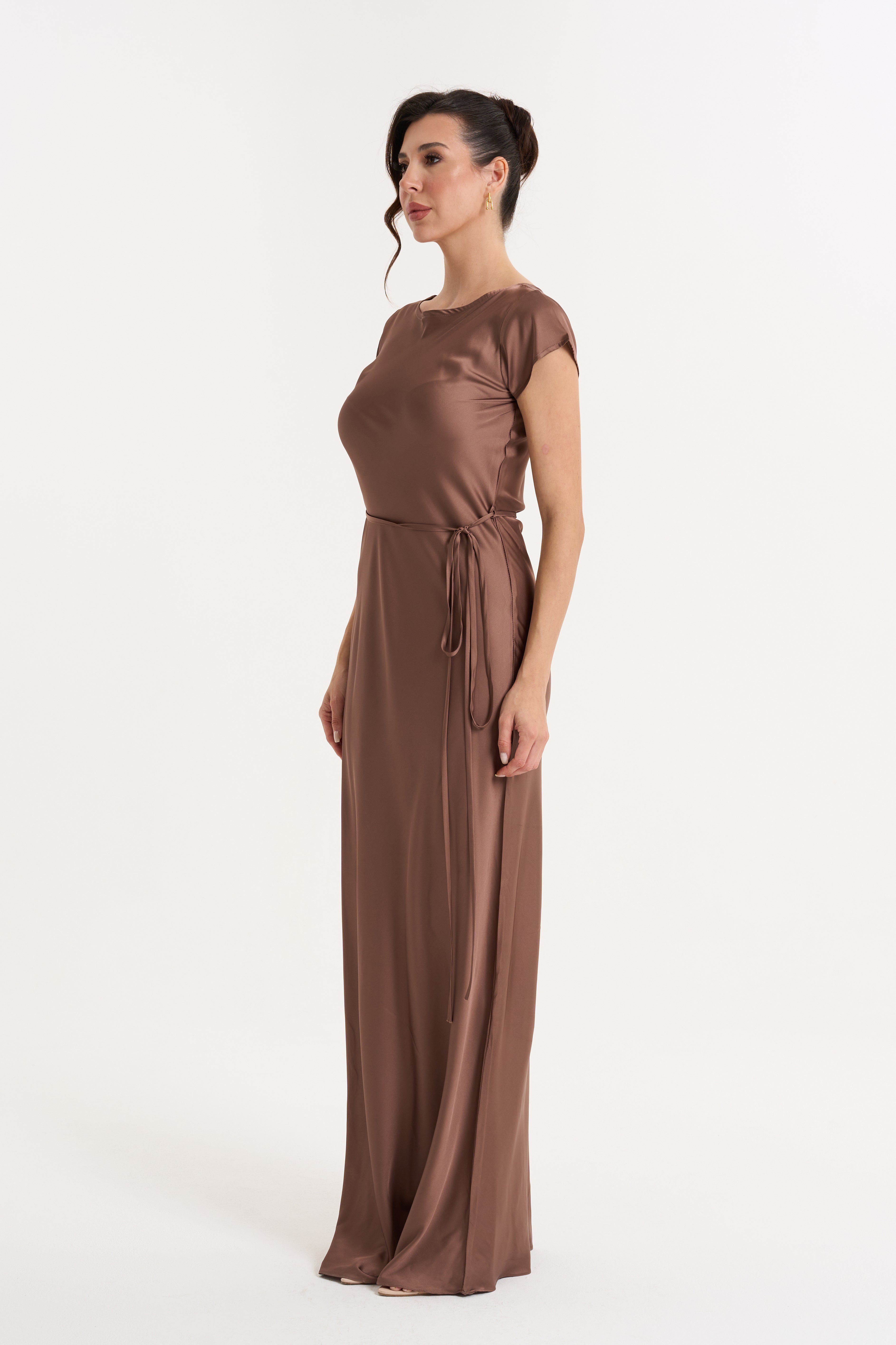 This piece is crafted from Armani silk — a luxurious satin fabric celebrated for its fluid drape and refined glow. Silky-smooth to the touch, the fabric moves effortlessly with the body, creating an elegant and sophisticated silhouette. Composition: 80% Armani Silk, 20% Polyester. Details: Cap sleeve, fitted waist with tie belt, full length. Model is 170cm and wears size S.