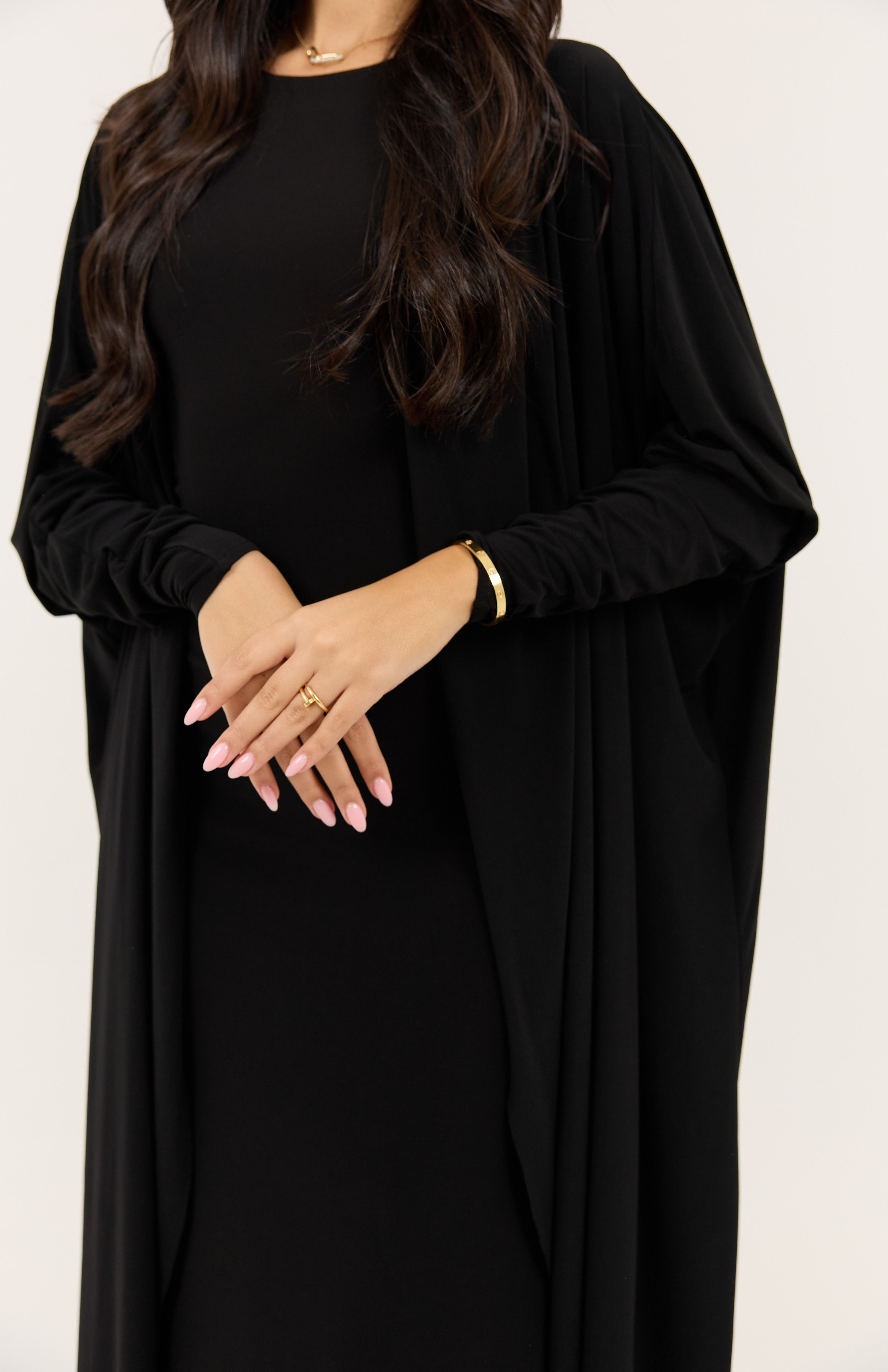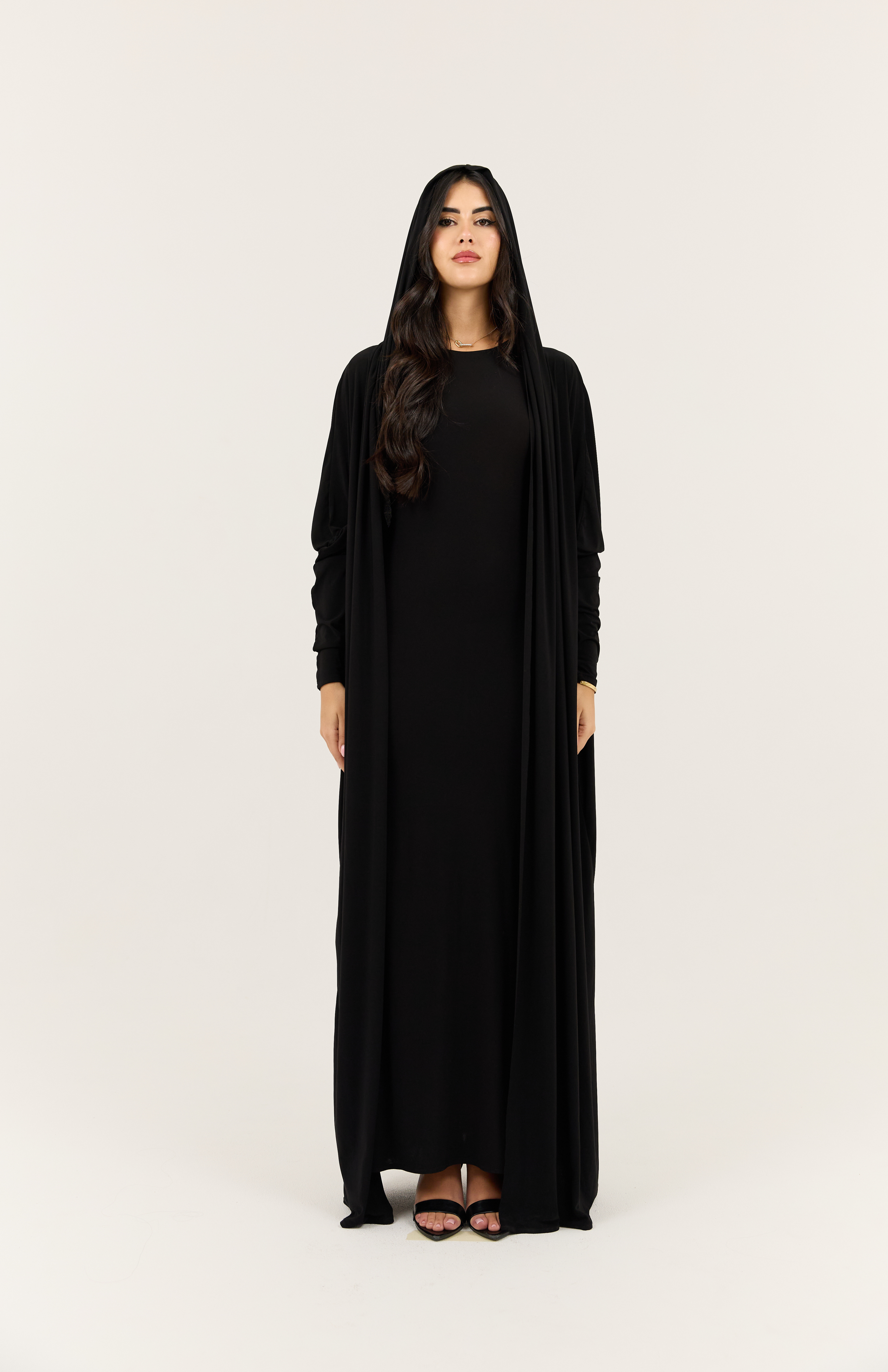 Crafted from luxurious Korean stretch fabric, this abaya balances comfort, breathability, and modest sophistication. The full-length, relaxed silhouette moves with you while providing refined coverage perfect for everyday elegance or special occasions.