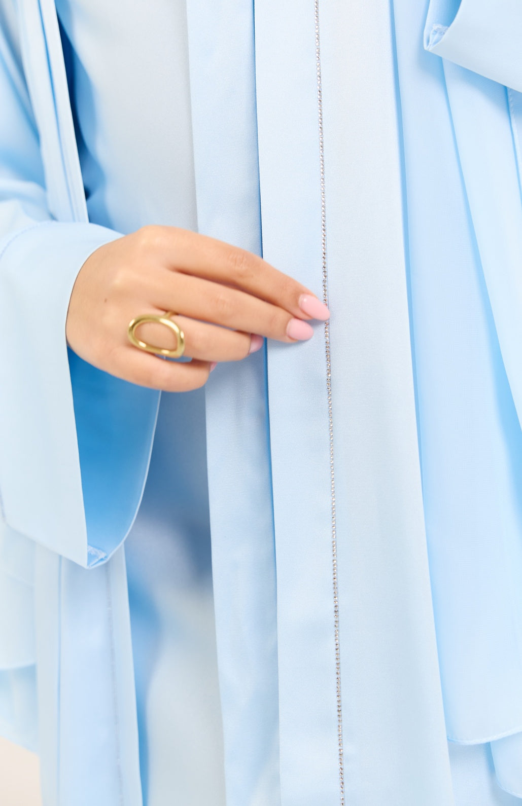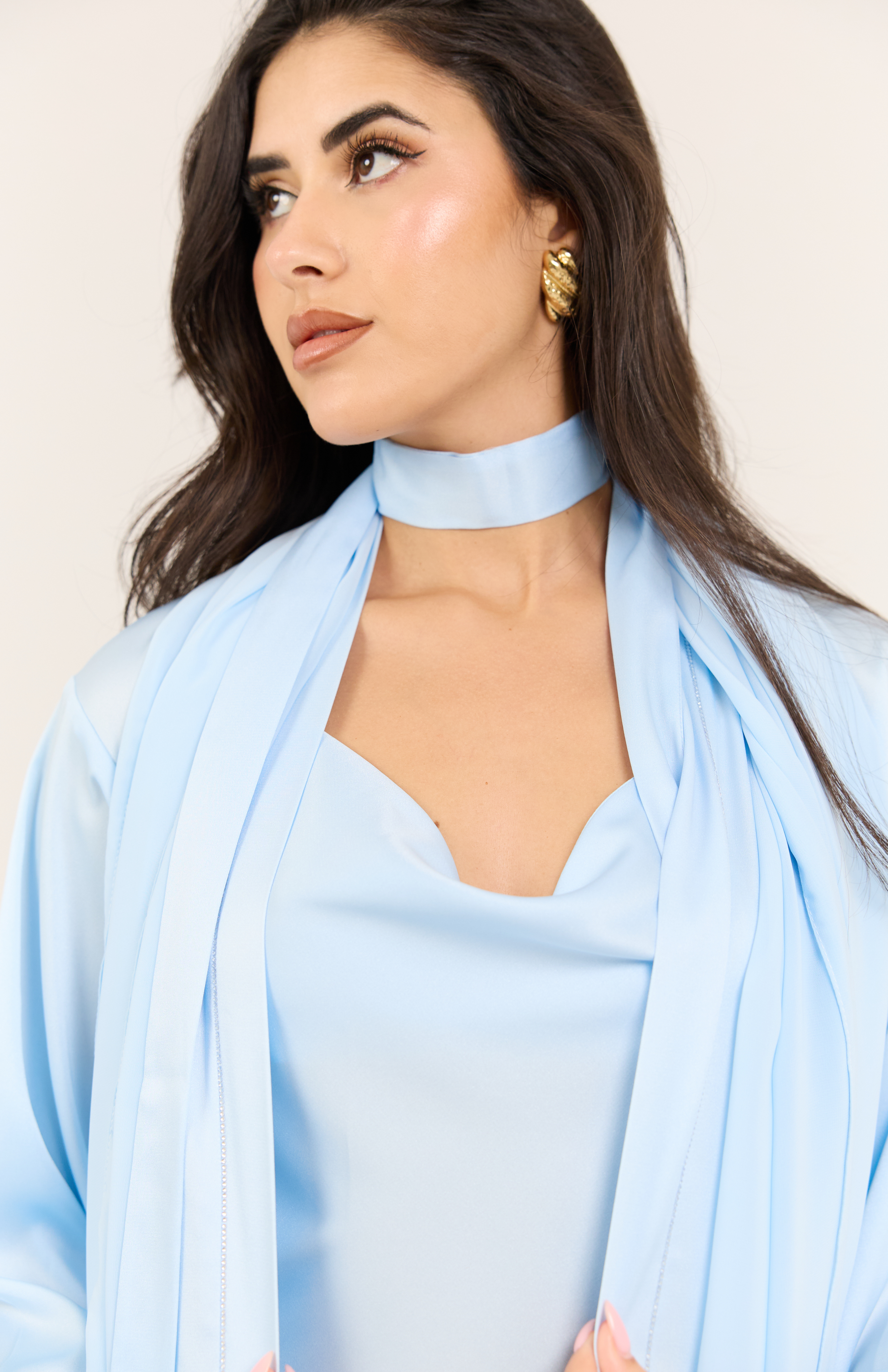 A full satin look, reimagined. This sophisticated four-piece ensemble includes a flowing maxi slip dress, a sleek bandeau top, an open abaya, and a coordinating belt — all crafted from lustrous Emirati satin. Lightweight, modest, and effortlessly chic, it’s designed to bring timeless refinement to your wardrobe. Perfect for evenings, special occasions, or elevated everyday wear.