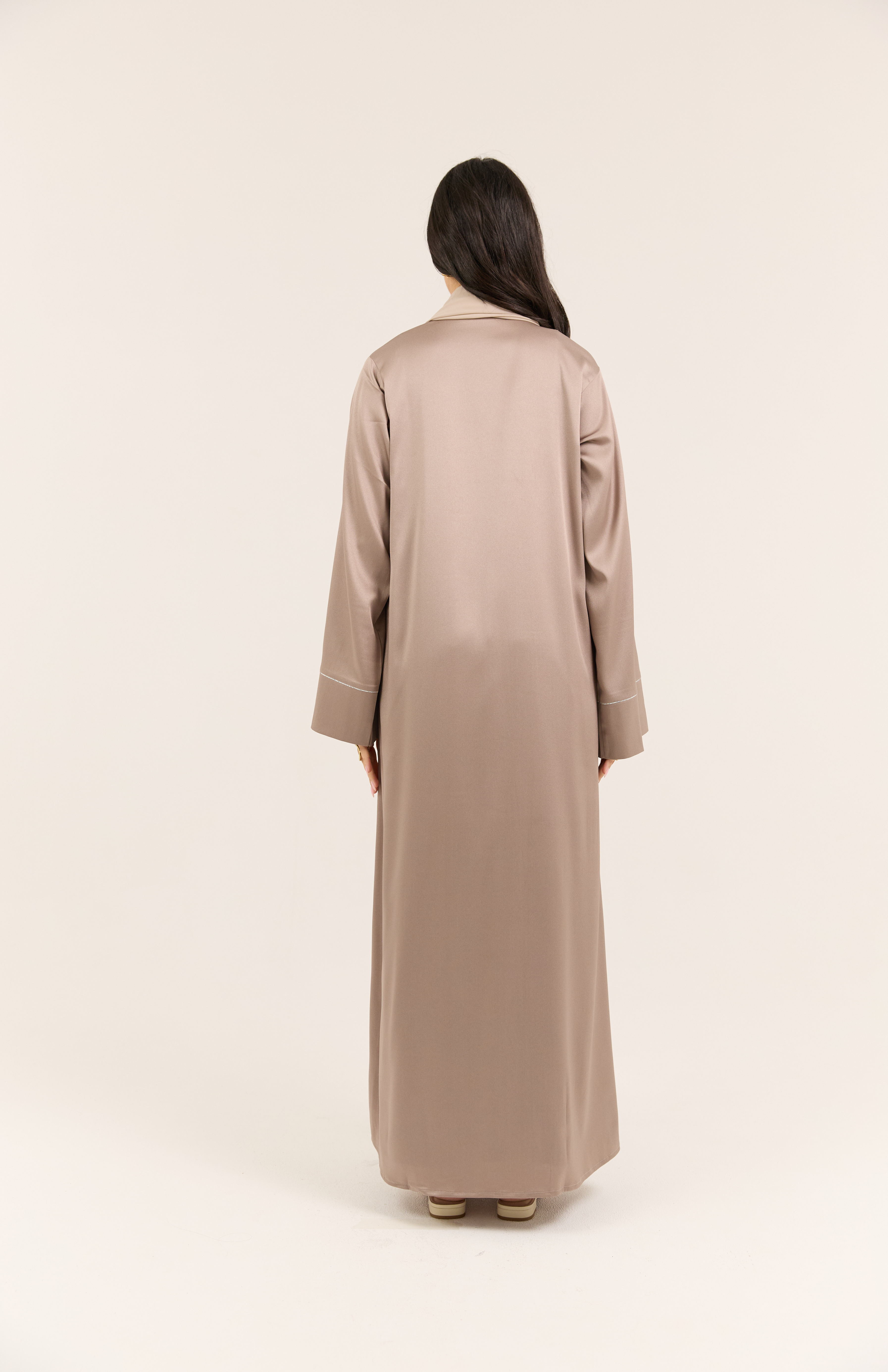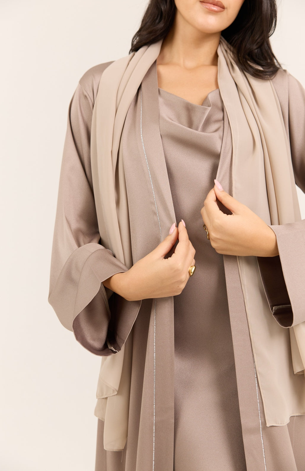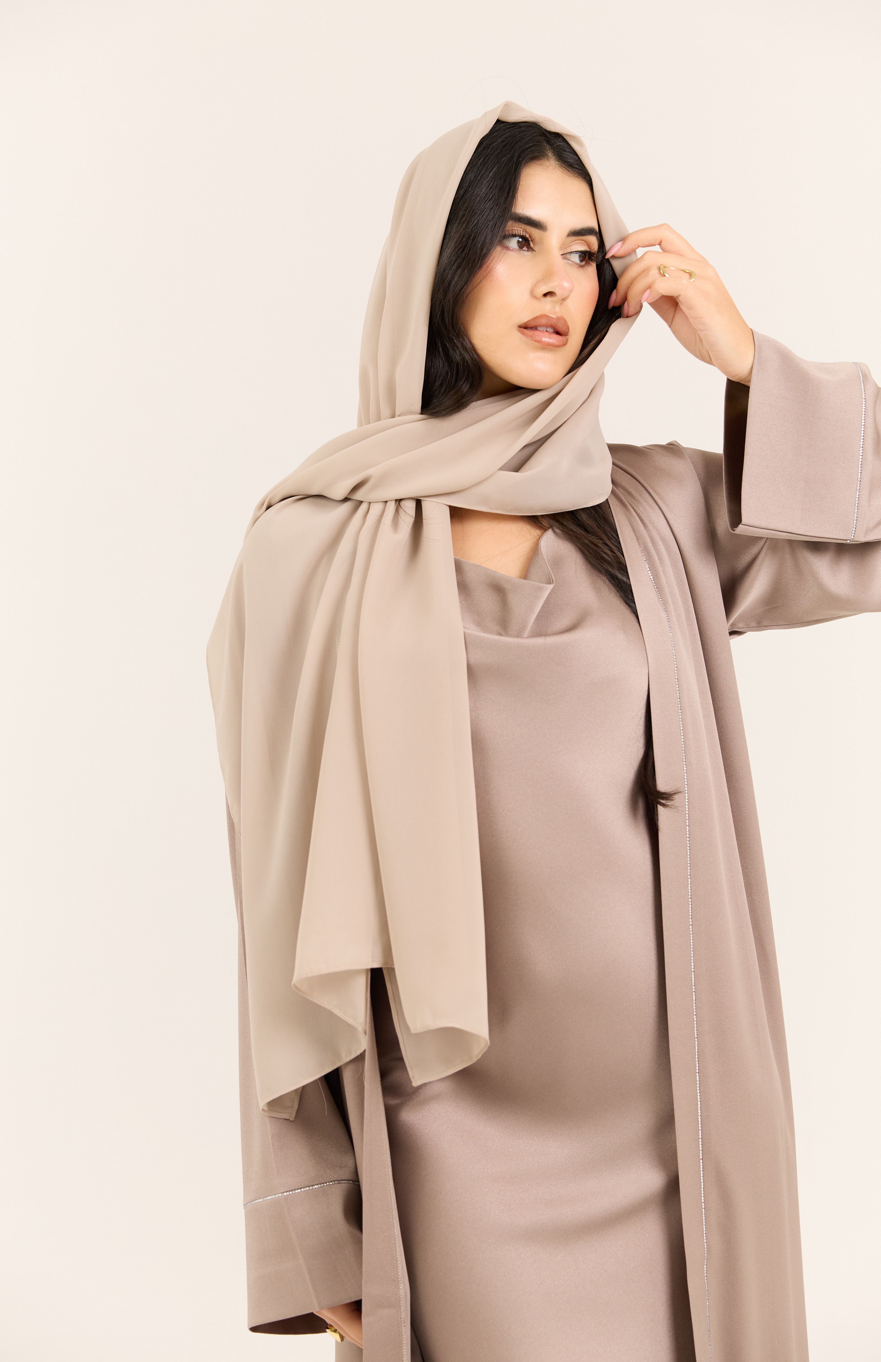 A full satin look, reimagined. This sophisticated four-piece ensemble includes a flowing maxi slip dress, a sleek bandeau top, an open abaya, and a coordinating belt — all crafted from lustrous Emirati satin. Lightweight, modest, and effortlessly chic, it’s designed to bring timeless refinement to your wardrobe. Perfect for evenings, special occasions, or elevated everyday wear.