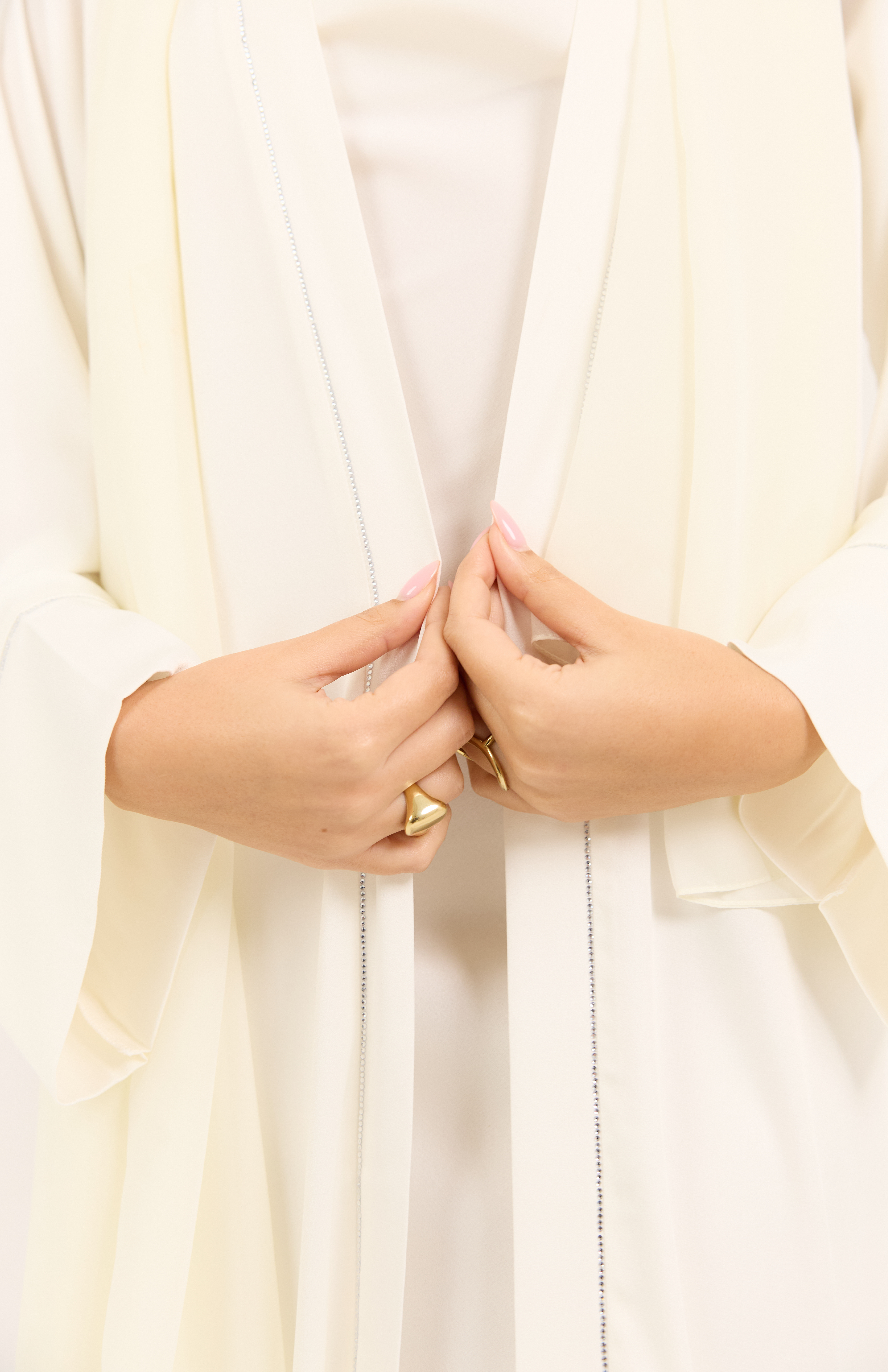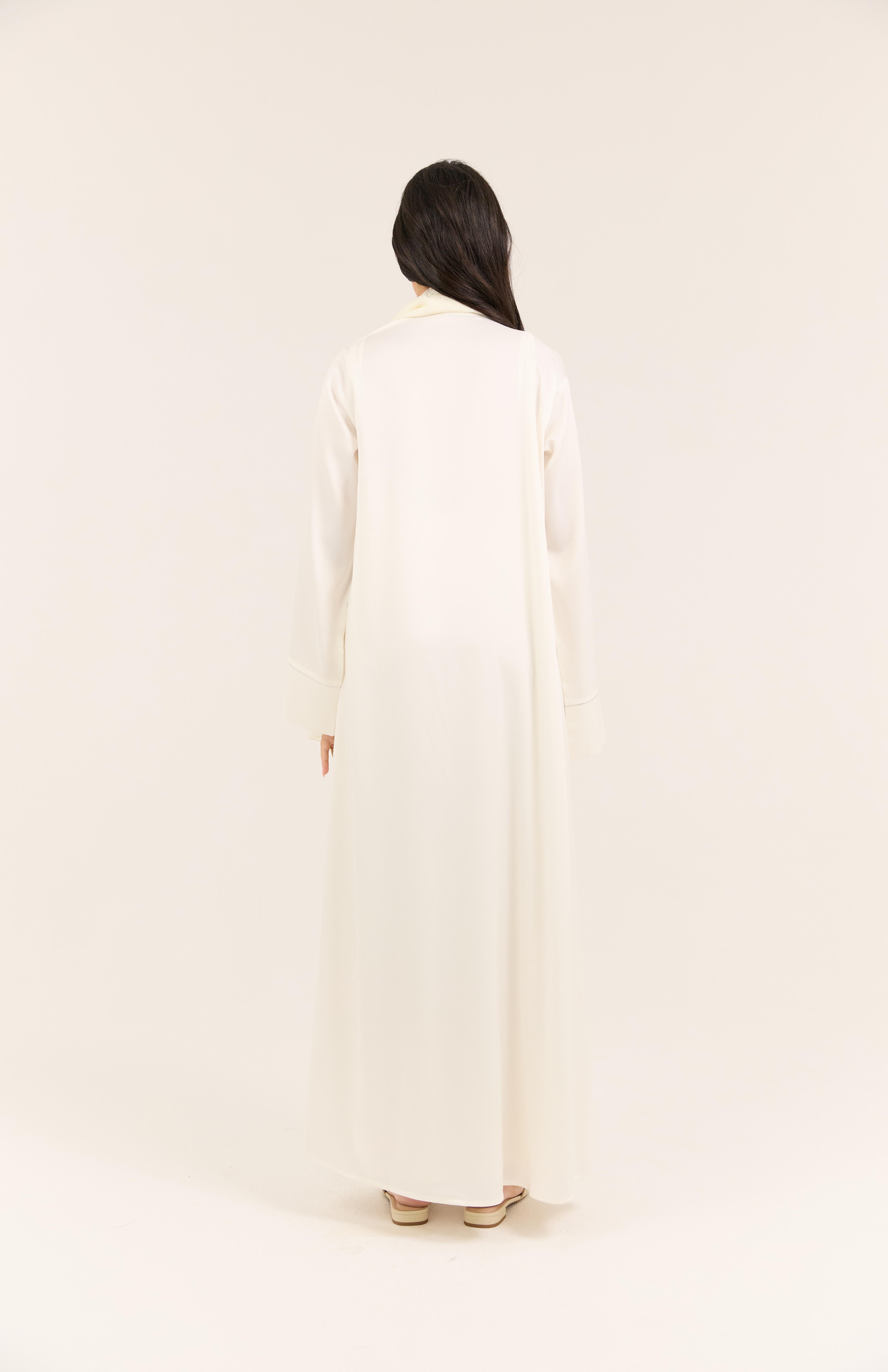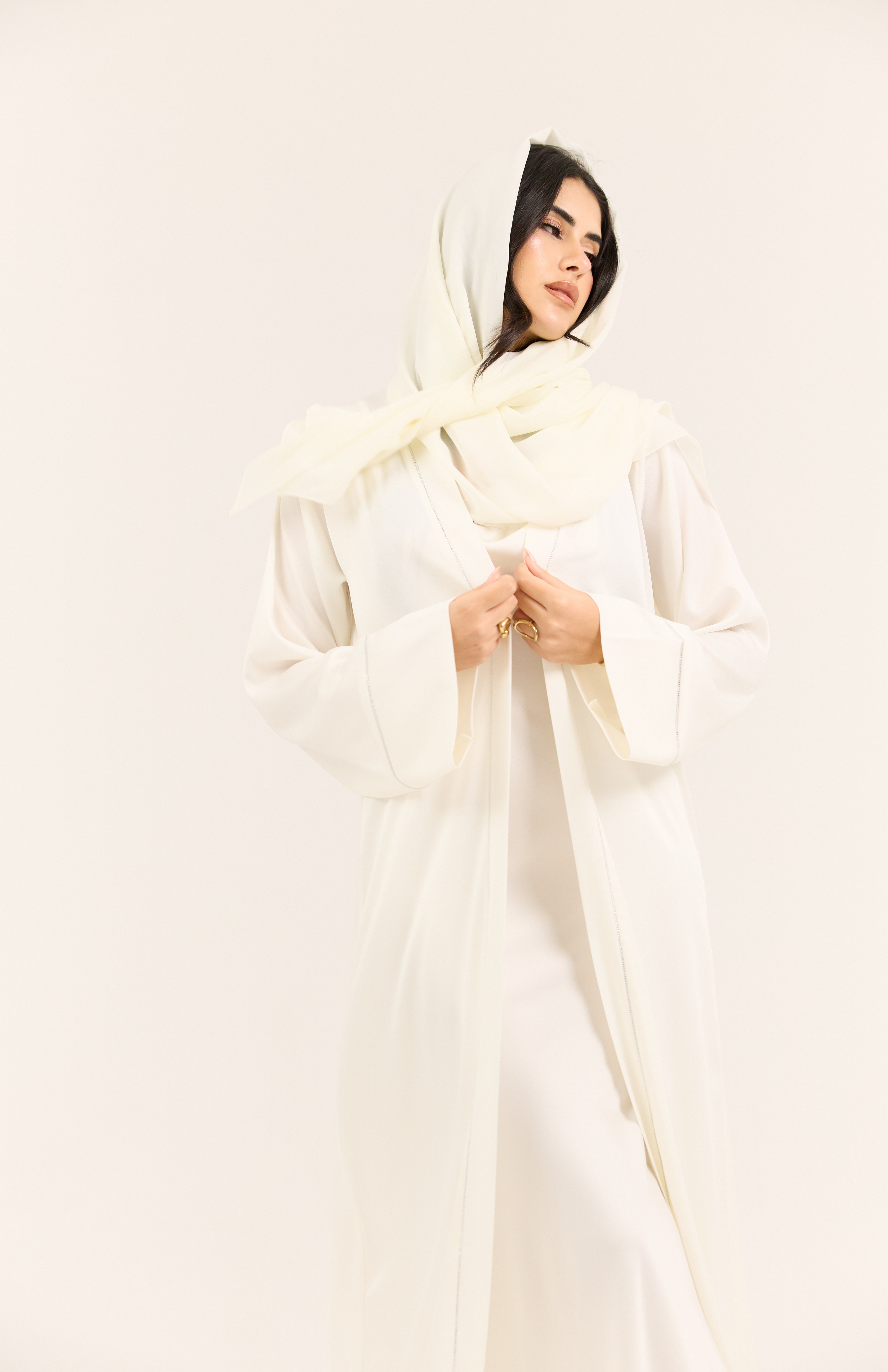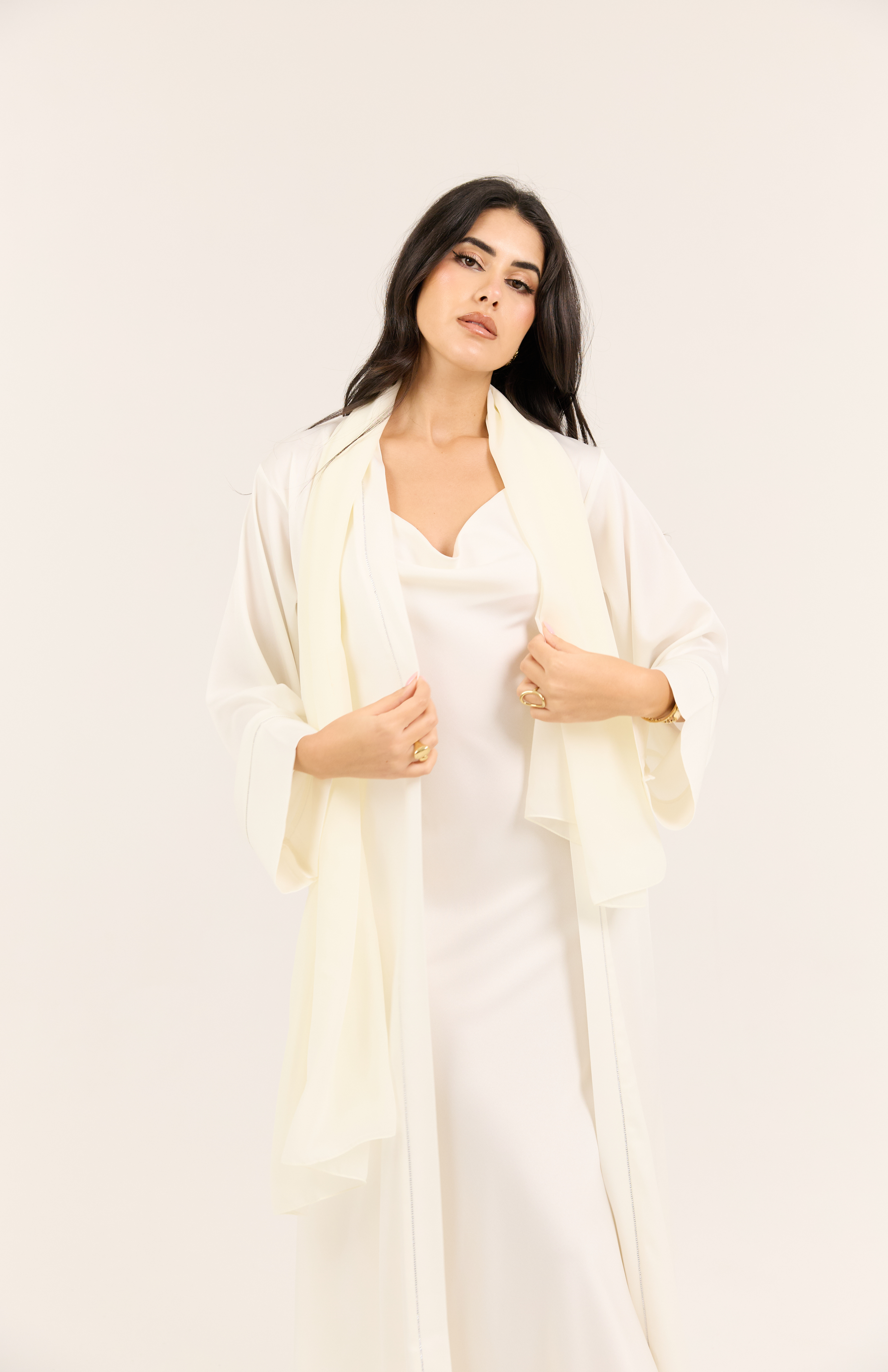 A full satin look, reimagined. This sophisticated four-piece ensemble includes a flowing maxi slip dress, a sleek bandeau top, an open abaya, and a coordinating belt — all crafted from lustrous Emirati satin. Lightweight, modest, and effortlessly chic, it’s designed to bring timeless refinement to your wardrobe. Perfect for evenings, special occasions, or elevated everyday wear.